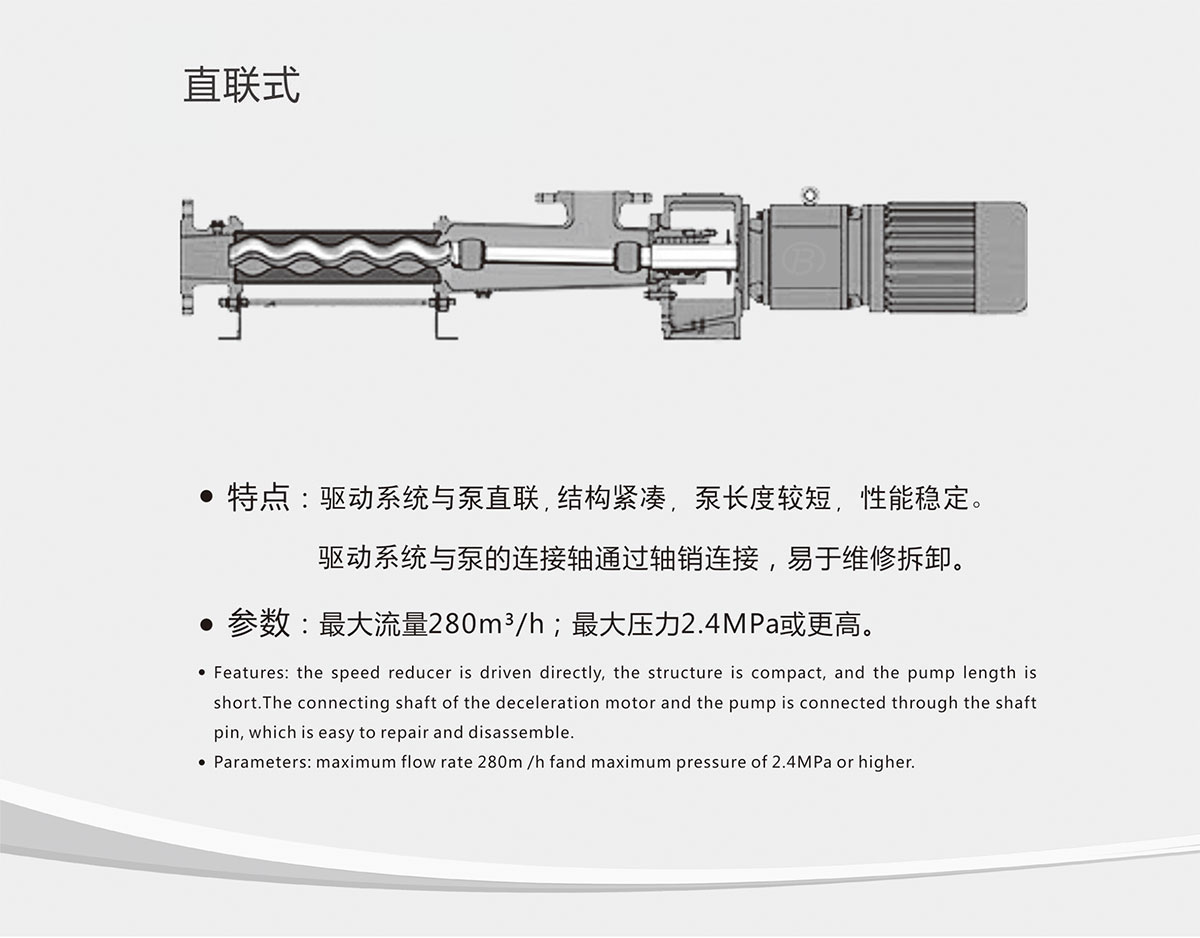 特点1 : 驱动系统与泵直联,结构紧凑,泵长度较短,性能稳定。